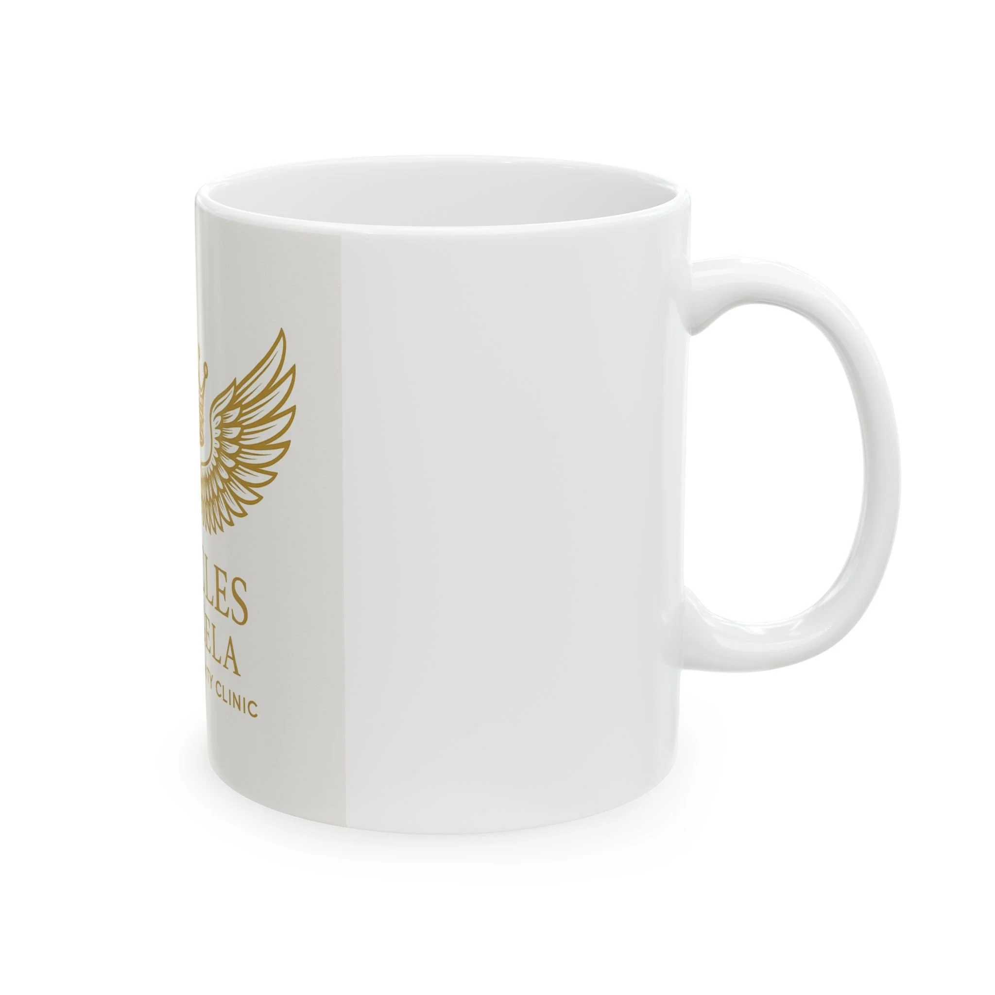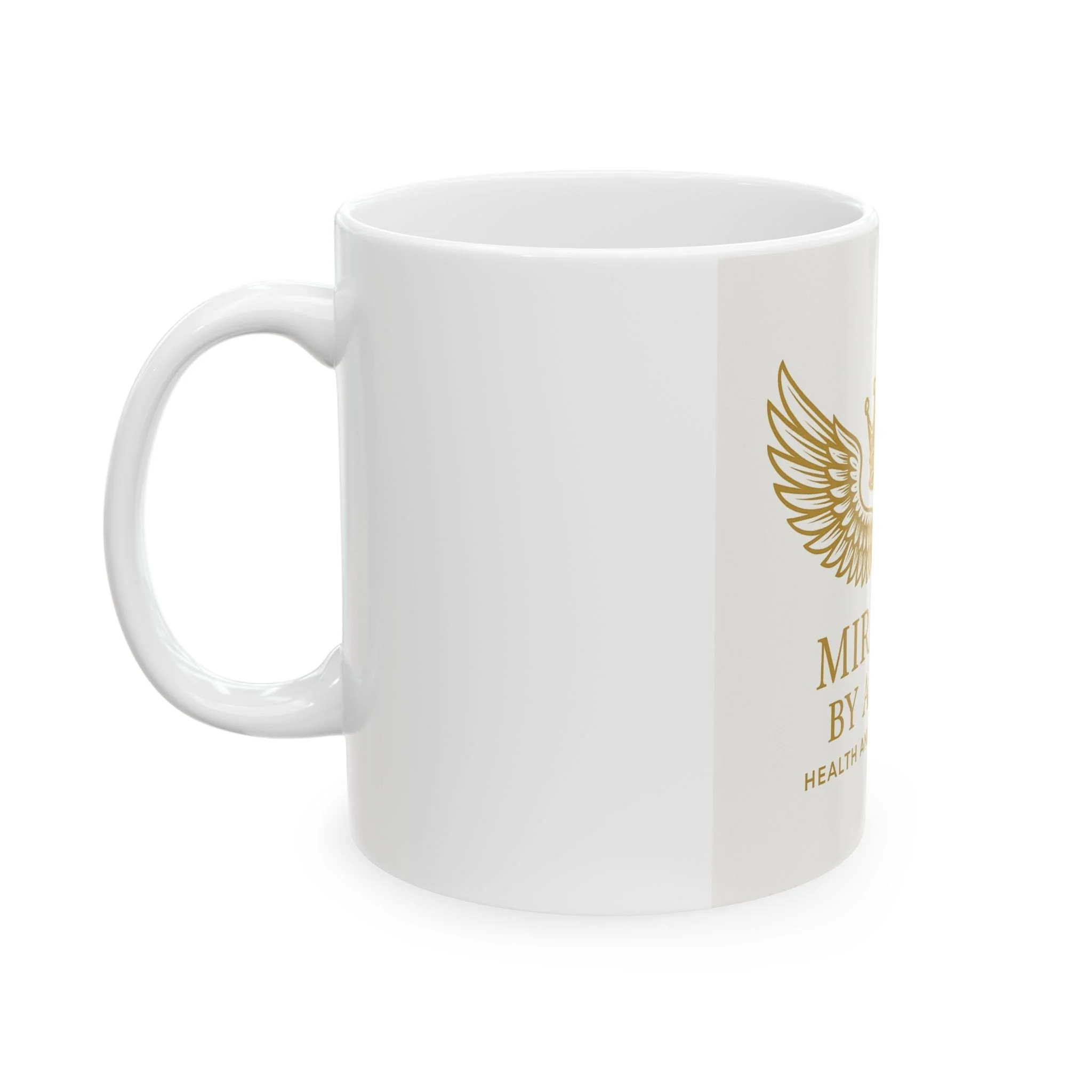 A glossy ceramic mug with a tasteful gold emblem that reads “Miracles by Angela” beneath a crowned pair of wings. Warm and refined, this mug turns a simple coffee or tea break into a moment of quiet elegance. It sits comfortably in hand with a classic C-handle and presents vibrant, durable printing that stays bright through daily use. Use it as a ritual cup at the clinic reception, on a serene morning at home, or as a thoughtful detail on consultation days — it feels polished without being fussy, and the shiny finish catches light to highlight the gilded design.